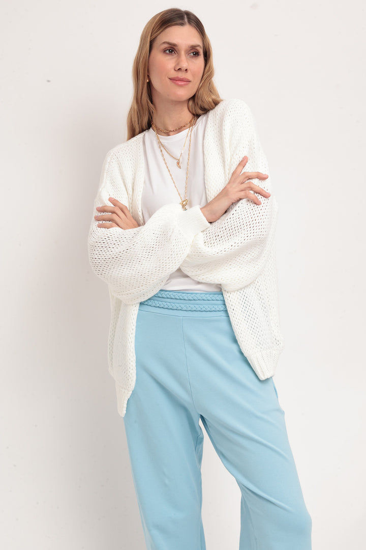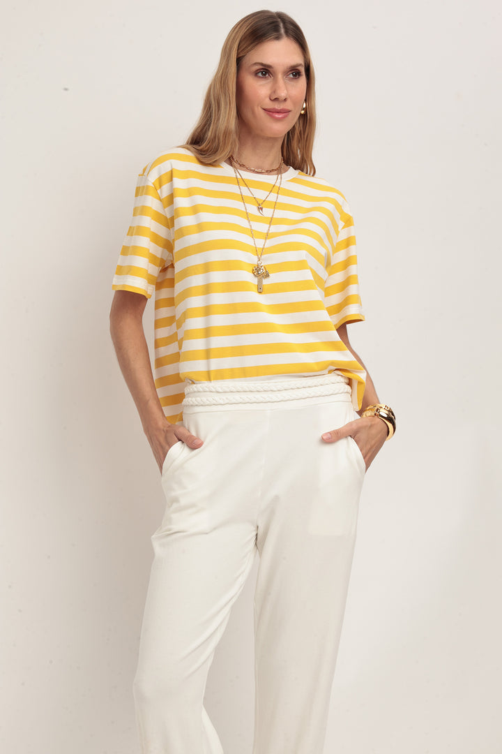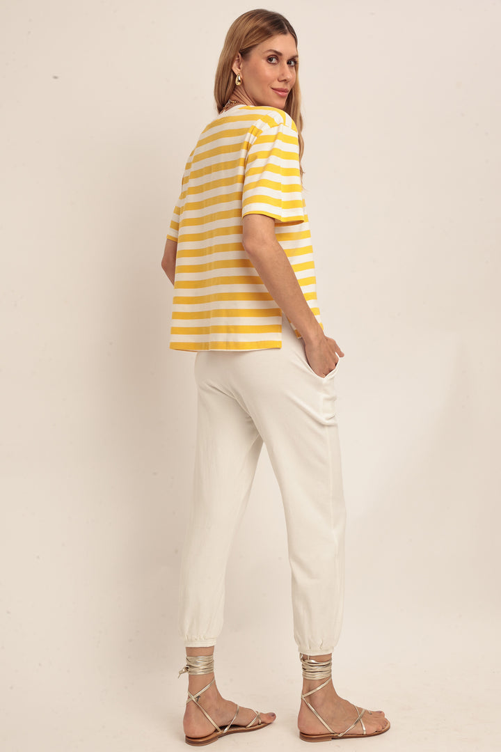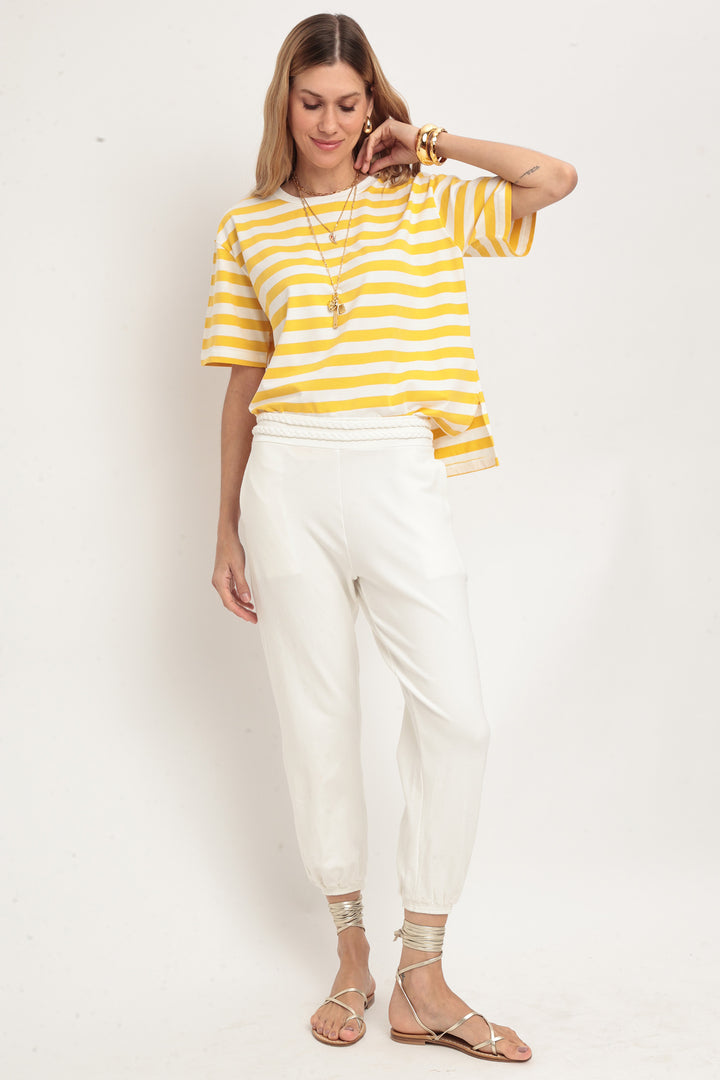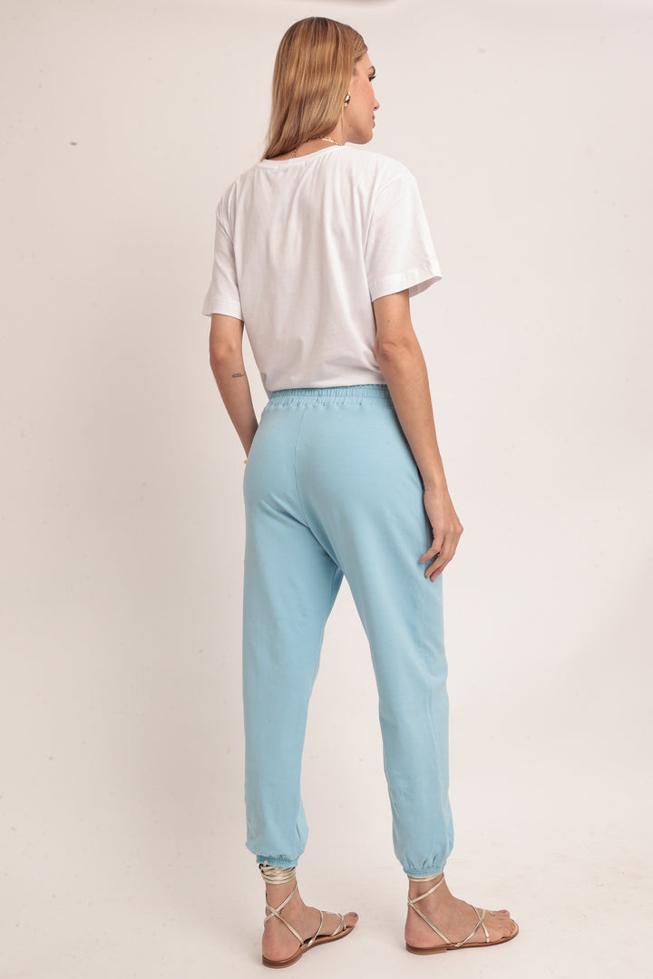 Calça de malha com elástico na cintura e barra, bolsos laterais.