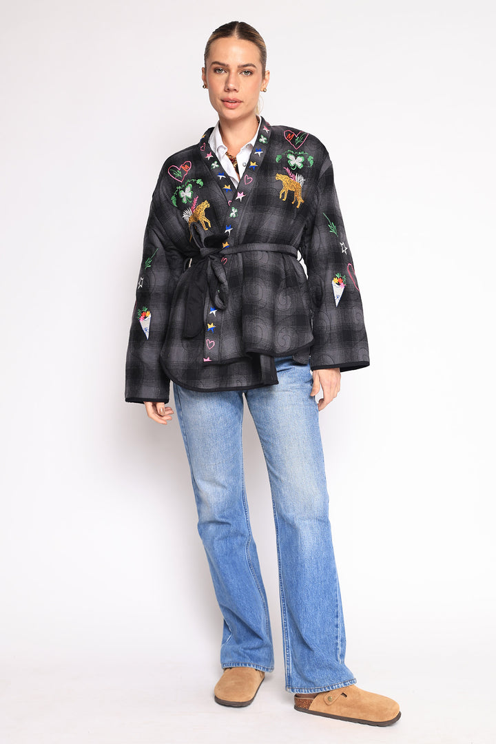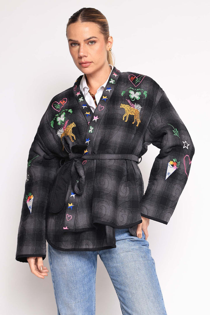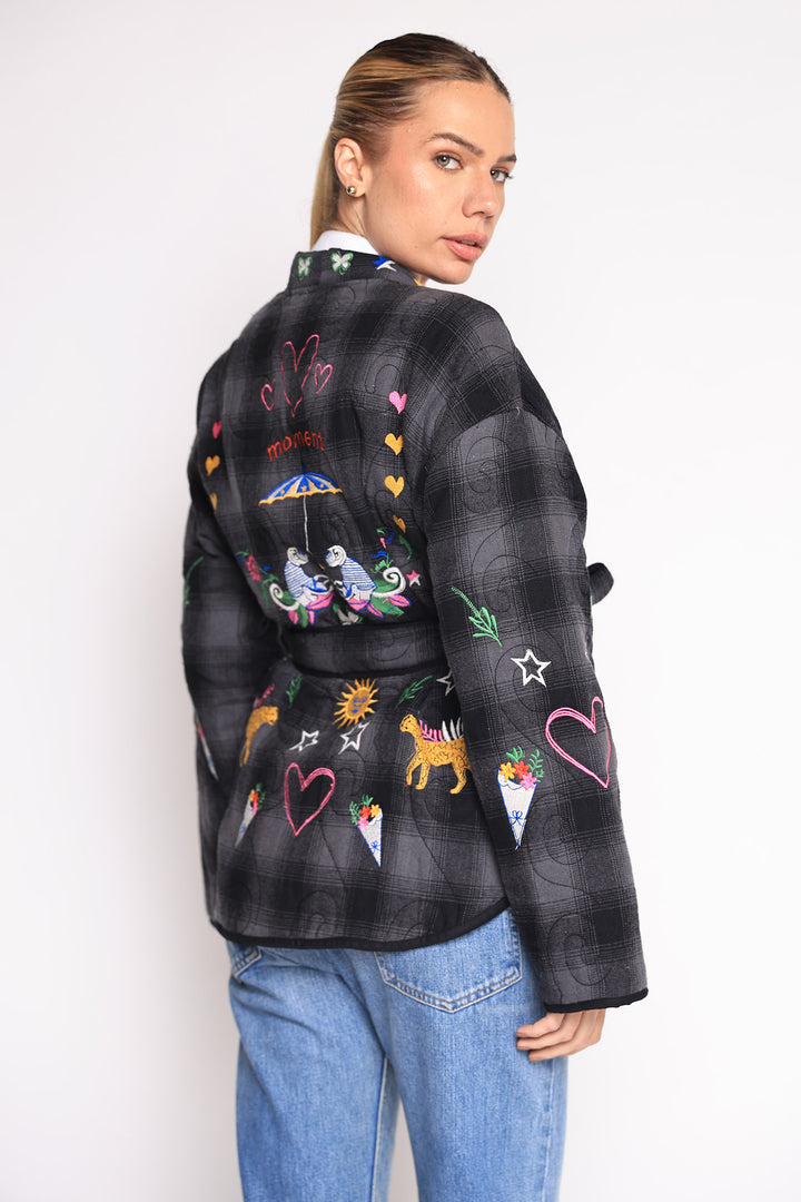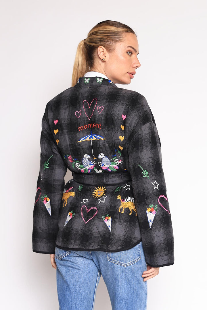 Casaco com bordados em linha e cinto de amarração na cintura