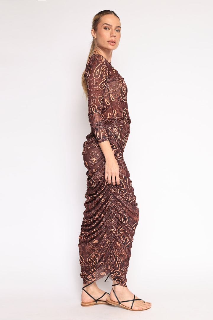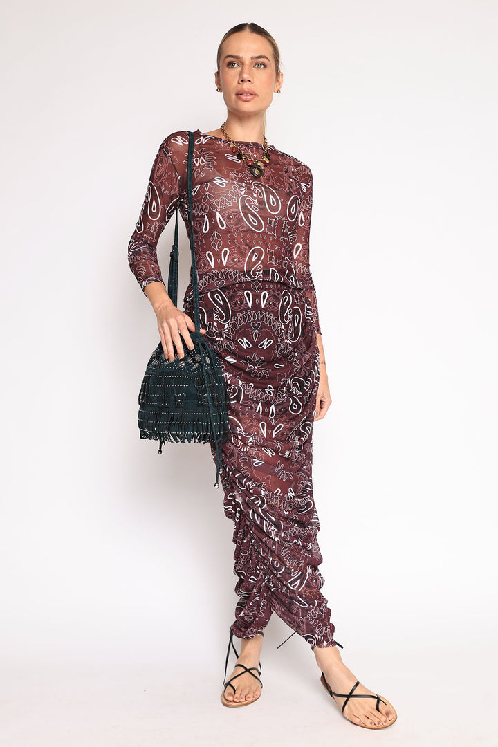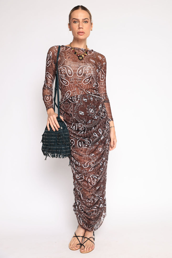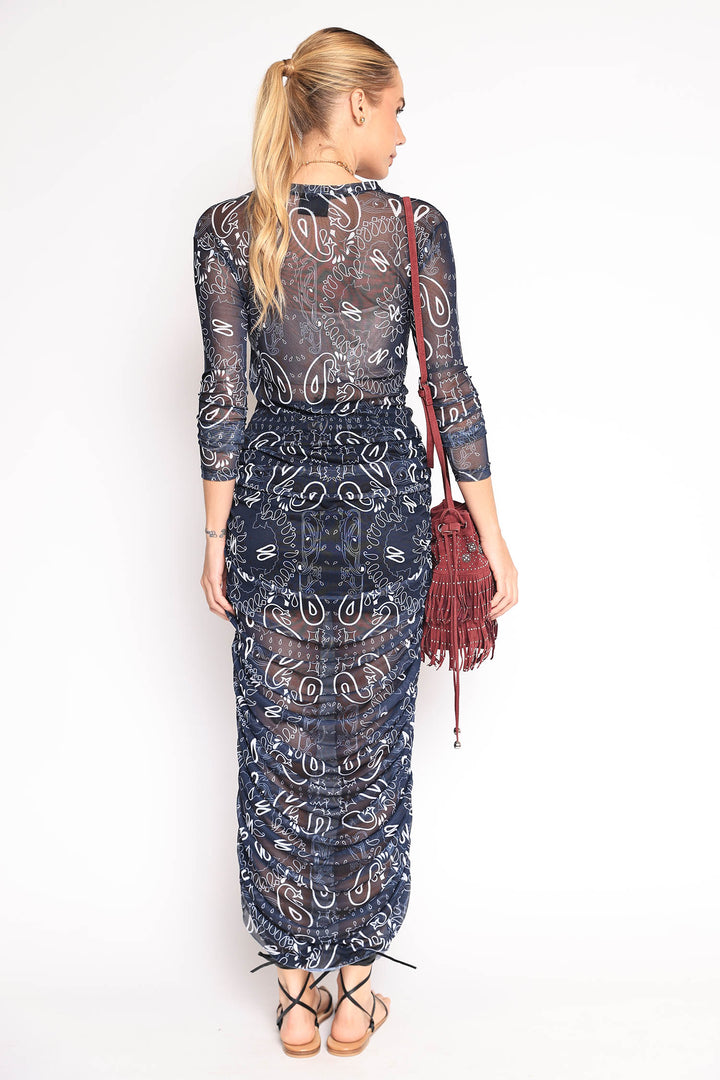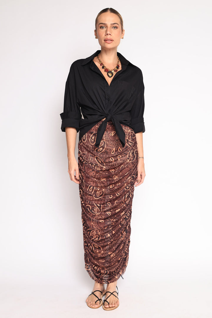 Saia de tule com estampa de bandana, drapeada nas laterais