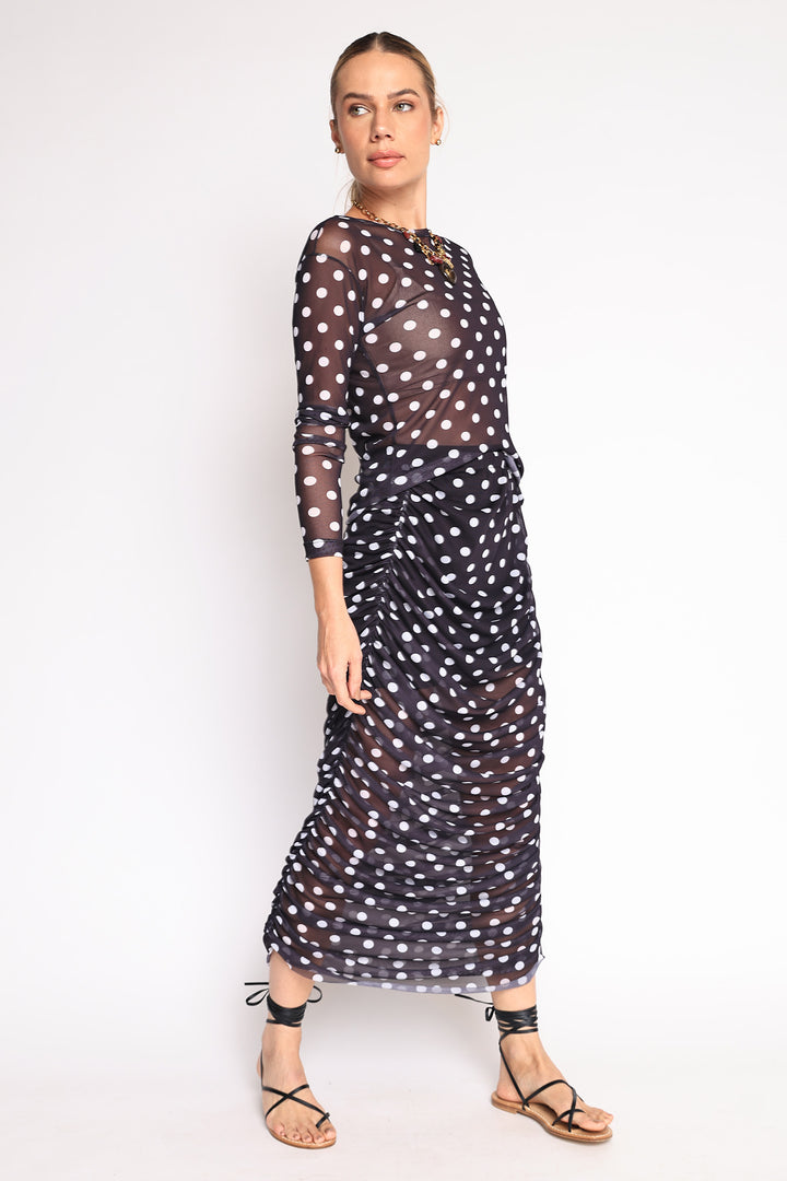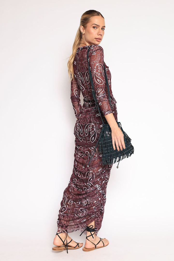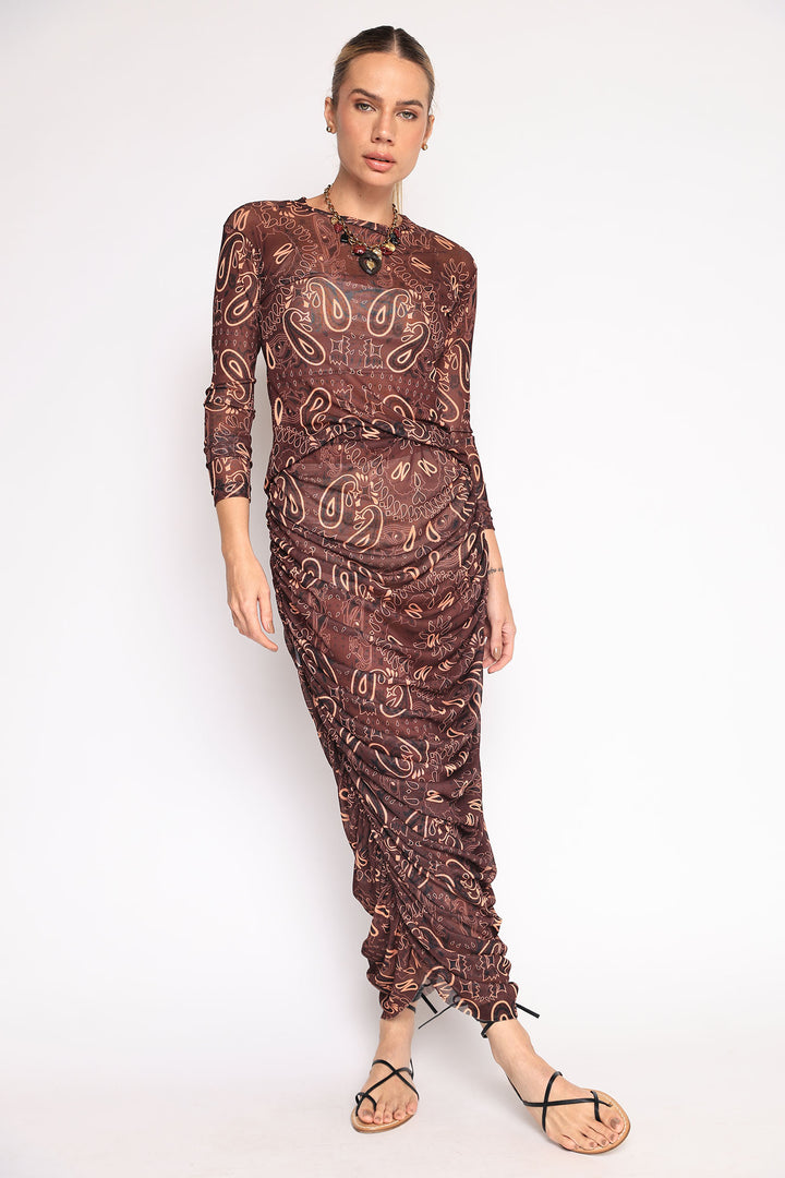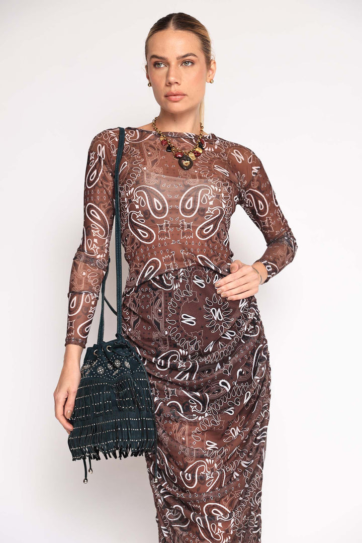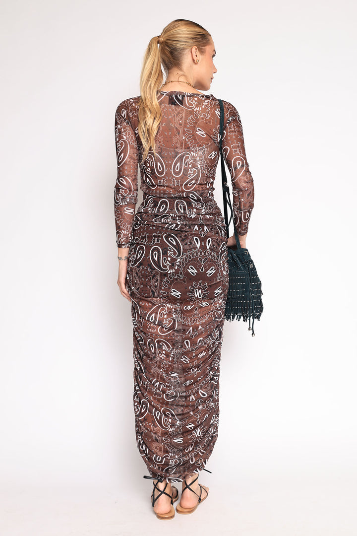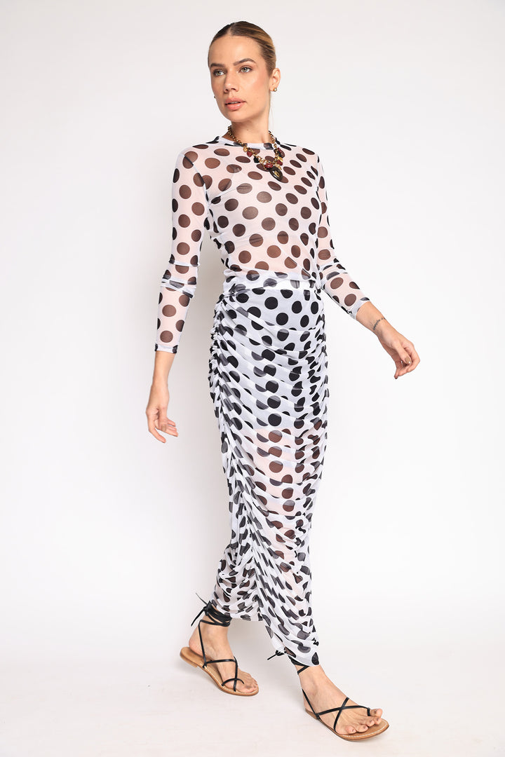Saia de tule com estampa de bandana, drapeada nas laterais