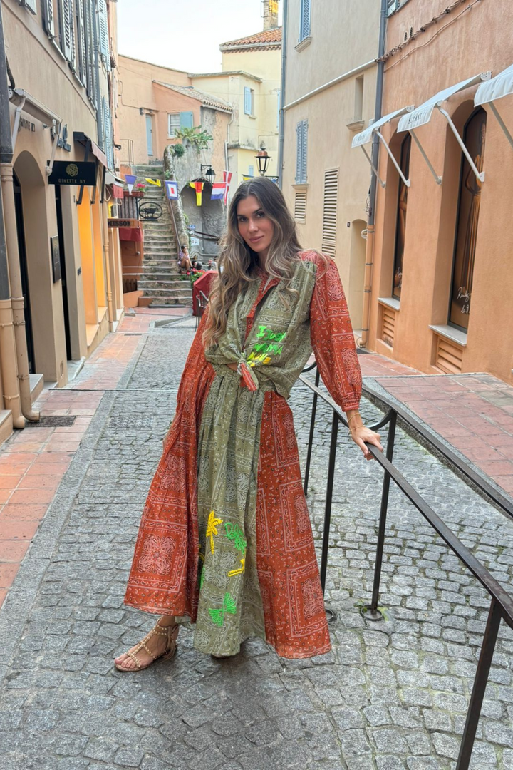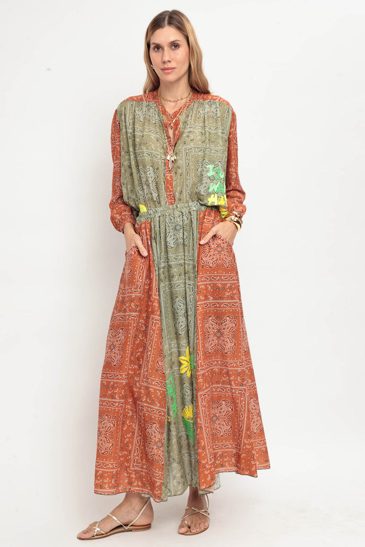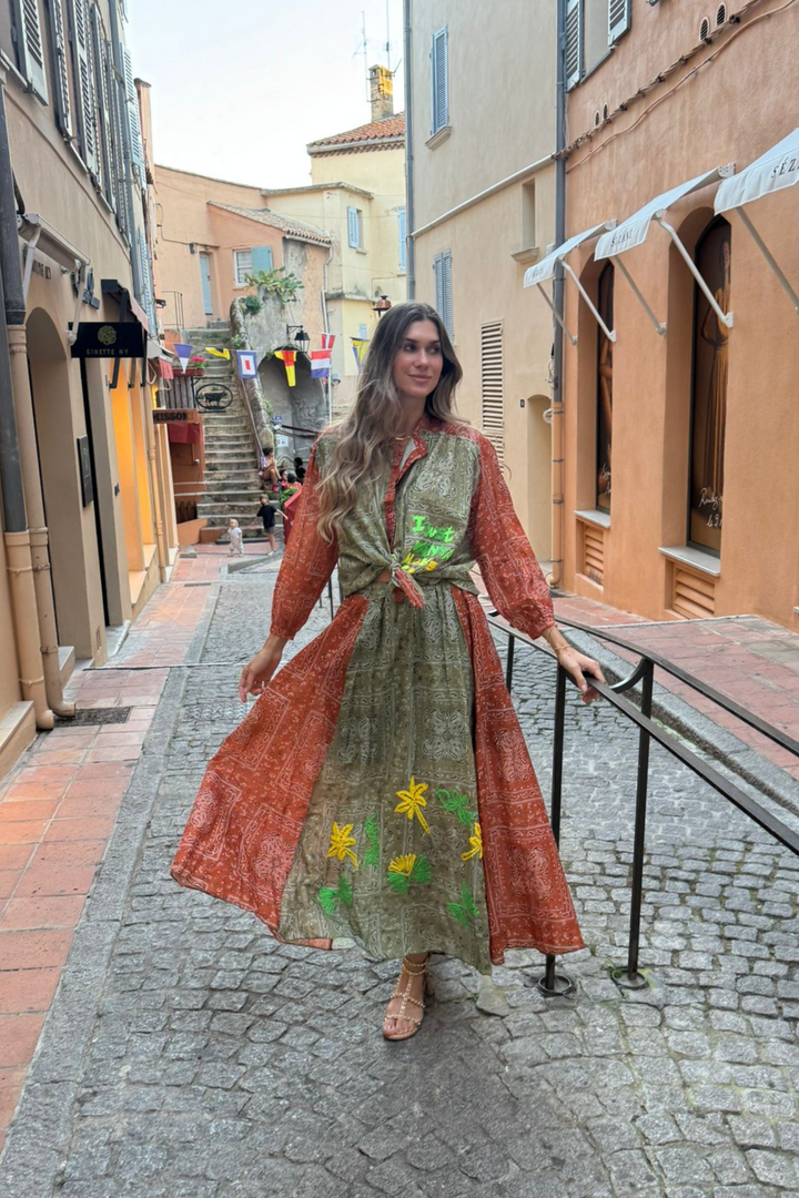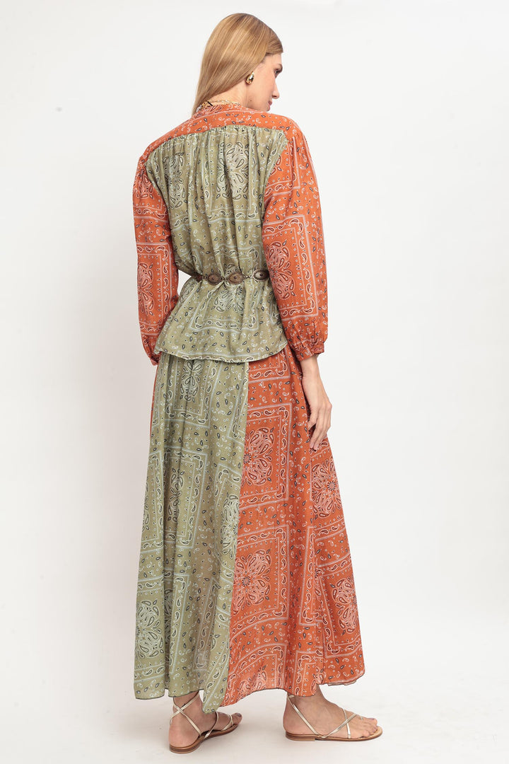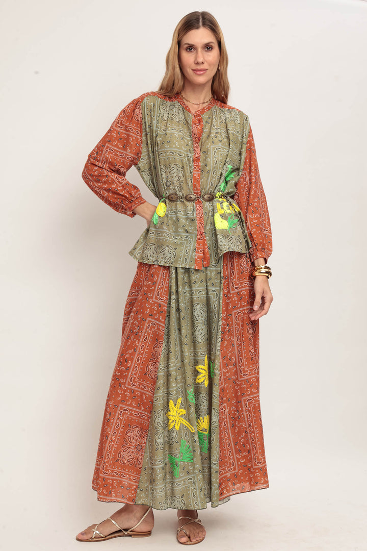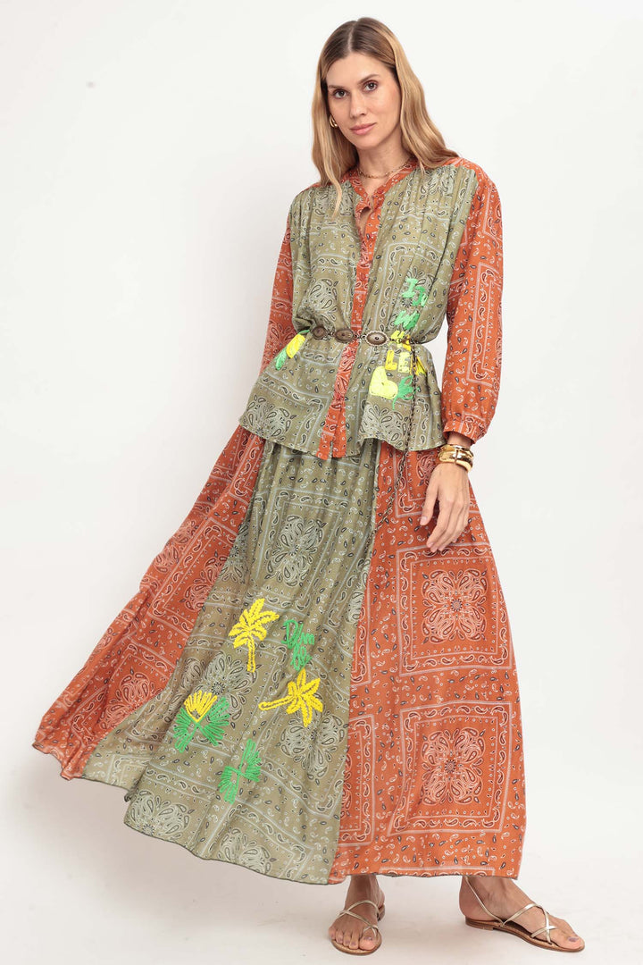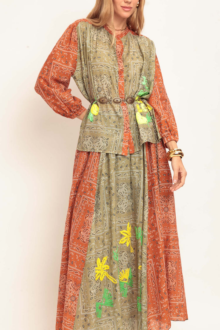 Conjunto de camisa e saia longa com estampa de bandana